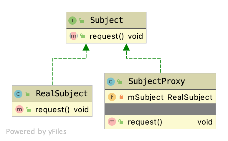 代理模式一般指的是静态代理,即在编译时实现,代理类 SubjectProxy 与被代理的真实类 RealSubject 实现同一个 Subject 接口,SubjectProxy 维护一个 RealSubject 实例,客户端通过 SubjectProxy 来间接使用 RealSubject。